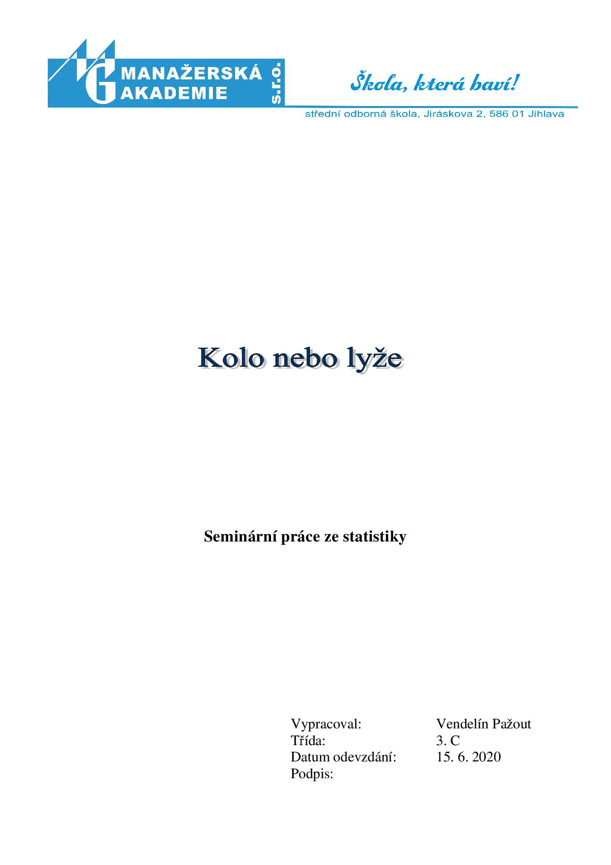 Seminární práce Seminárním práce je závěrečným výstupem předmětu Statistika a má rozhodující váhu pro klasifikaci na konci školního roku. Několik zásadních informací viz: Struktura seminární práce. Při realizaci budeme postupovat v těchto krocích: Zpracování seminární práce Vzorová práce žáka Pažouta: [1] [2] [3] [4] [5] [6] [7] [8] [9] |